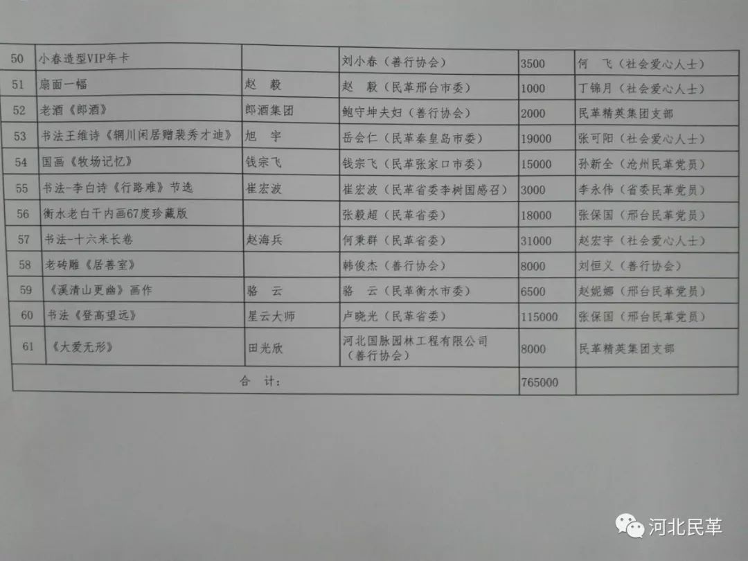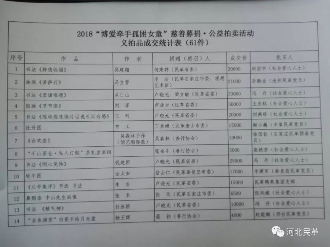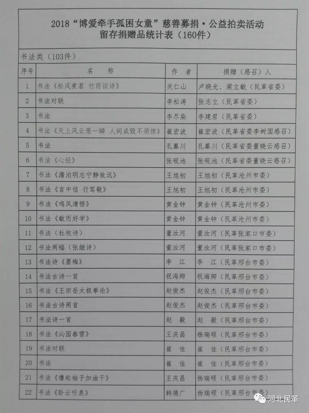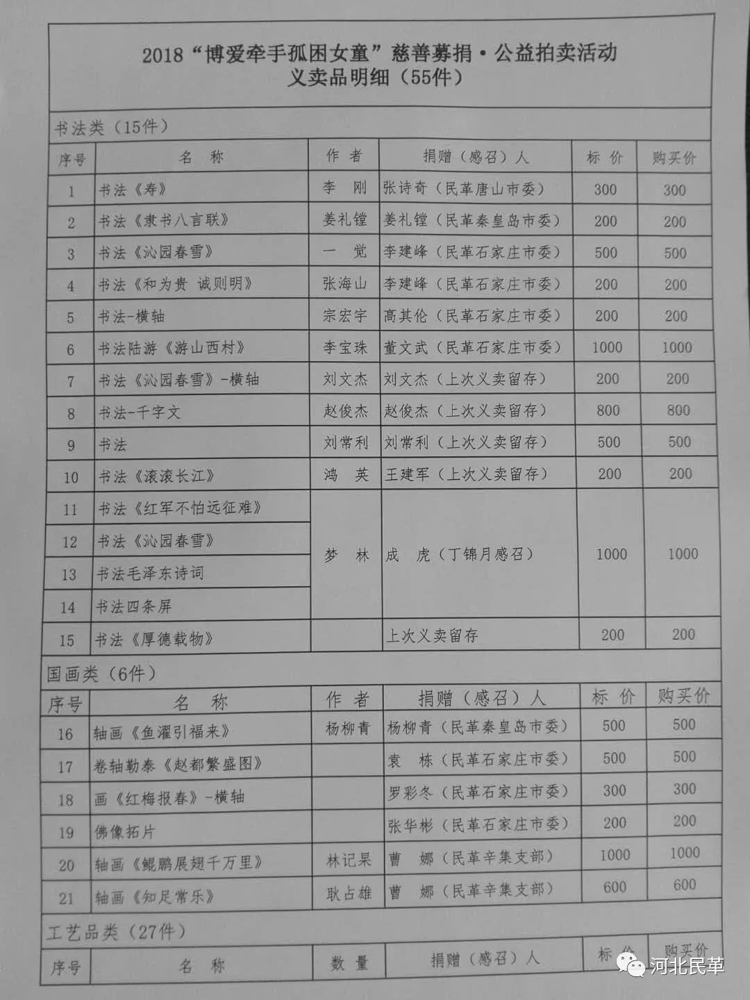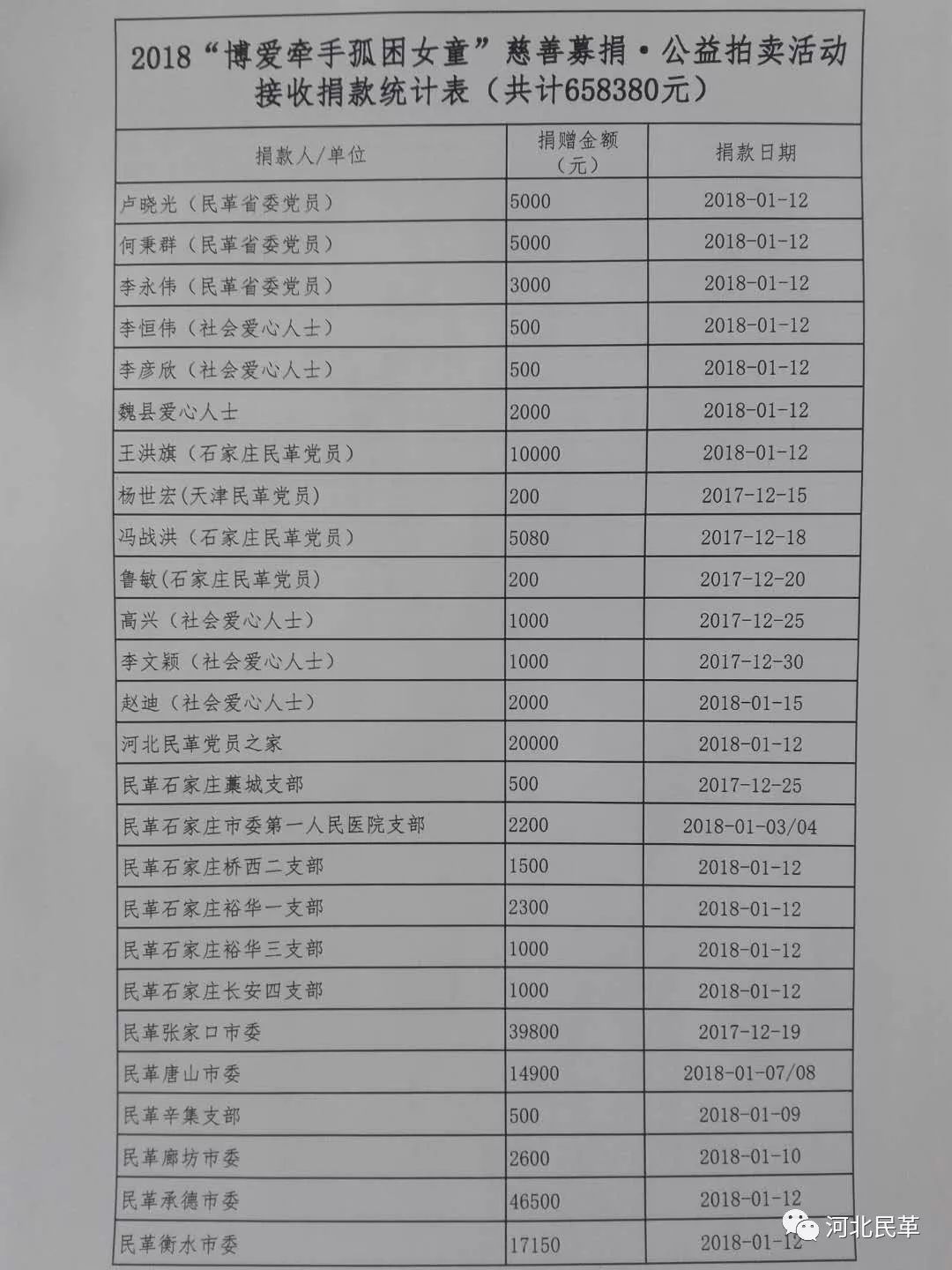 2018“博爱牵手孤困女童”公益拍卖活动已圆满结束,本次活动受到了广大民革党员和社会各界爱心人士的热情支持,为将慈善活动持续下去,民革省委将继续接收爱心捐款、捐物,捐物将用于后续义拍义卖。截至2018年1月30日,共接收捐款658380元,接收捐物268件。其中,义拍品61件拍得善款765000元,义卖品卖出55件筹得善款21941元,剩余160件捐赠物已登记在册留存省委会,用于今后的义拍义卖活动。现将捐款、捐物情况公示如下,接受各界爱心人士监督。