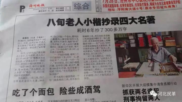 在习近平总书记中国梦的感召下,2013年4月开始,年逾八旬的沧州民革老党员李兆顺暗自拟定了用小楷抄写我国四大名著的梦想计划,经过6年多笔耕不辍,2019年7月14日终于将总共330余万字的四大名著,抄写完毕。向中华人民共和国70华诞,献上了一份大礼。