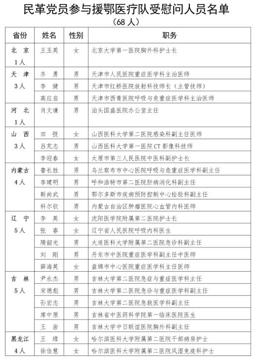 根据民革中央部署,民革中央办公厅和中山博爱基金会联合印发活动通知,由民革省级组织开展了人员统计和资格审核,提交了相关证明。中山博爱基金会在完成立项、拨款等程序后,已于4月20日直接向68名援鄂党员医务工作者个人账户拨付了慰问金,同时委托民革湖北省委会向本省124名一线党员医务工作者发放慰问金。