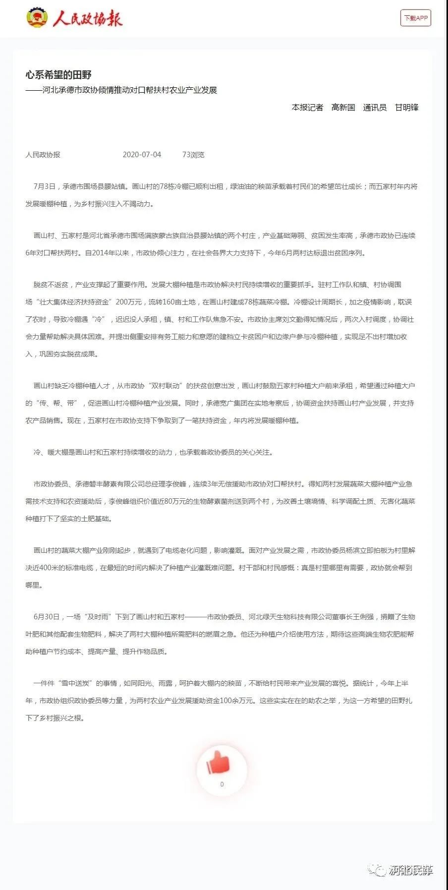 7月4日,以《心系希望的田野——河北承德市政协倾情推动对口帮扶村农业产业发展》为题,《人民政协报》、人民政协网、河北政协网、承德政协网等多家媒体对此事进行了报道。