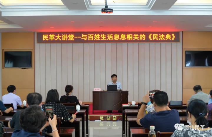 ?8月9日下午,“民革大讲堂——与百姓生活息息相关的《民法典》”在省民主党派大楼开讲,此次讲座由民革河北省委会副主委、省高级人民法院副院长甄树清主持,民革河北省委会社法委副主任、省高级人民法院民三庭副庭长宣建新授课。民革河北省委会驻会副主委梁立敏带领民革省委会机关全体人员,民革石家庄市委会驻会副主委乔茜及石家庄民革党员共50余人现场听讲,本次活动面向全省民革党员进行网络直播,共600余名民革党员网络听讲。