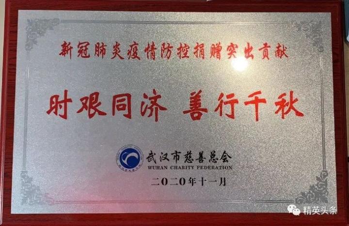 祝贺!精英集团被武汉市慈善总会授予“新冠肺炎疫情防控捐赠突出贡献”牌匾