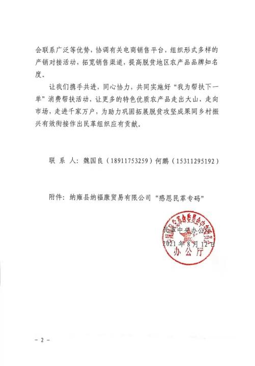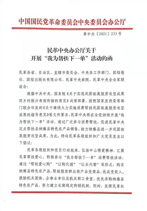 近日,民革中央办公厅发出《关于开展“我为帮扶下一单”活动的函》。倡议指出,民革中央将在全党持续开展“我为帮扶下一单”活动,通过广泛参与消费帮扶,促进民革中央定点帮扶县纳雍县特色农产品销售,助力纳雍县进一步巩固拓展脱贫攻坚成果。