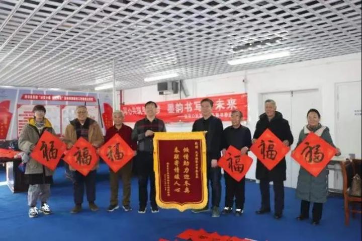 民革张家口市委员会专职副主委李志带领民革党员、书法家一行11人赴崇礼太子城冰雪小镇颁奖广场文创商街营地现场书写春联、福字,为负责赛时保障场馆内各类工作人员和志愿者食宿的桥东区文创商街营地装点节日喜庆氛围,营地代表发言表示:“张家口民革组织7位书法家现场创作冬奥主题春联、福字,装点了节日喜庆氛围,展现出中华优秀传统文化,我代表营地对书春送福一行人表示热烈欢迎和衷心感谢”。活动后,营地回赠张家口民革锦旗一面“倾情助力迎冬奥,春联寄情暖人心”,充分体现出助力冬奥、服务盛会的良好民革形象。