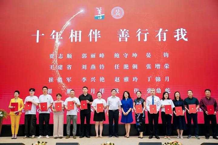 河北民革企业家联谊会会长、精英集团董事长兼总裁翟志海(左8),河北省善行使者公益协会会长李洁(右7)为“十年相伴善行有我”荣誉获得者颁奖