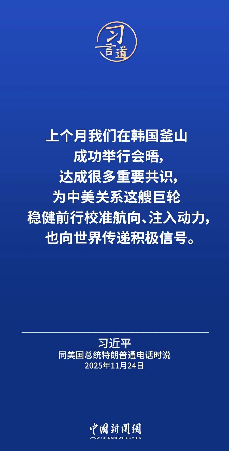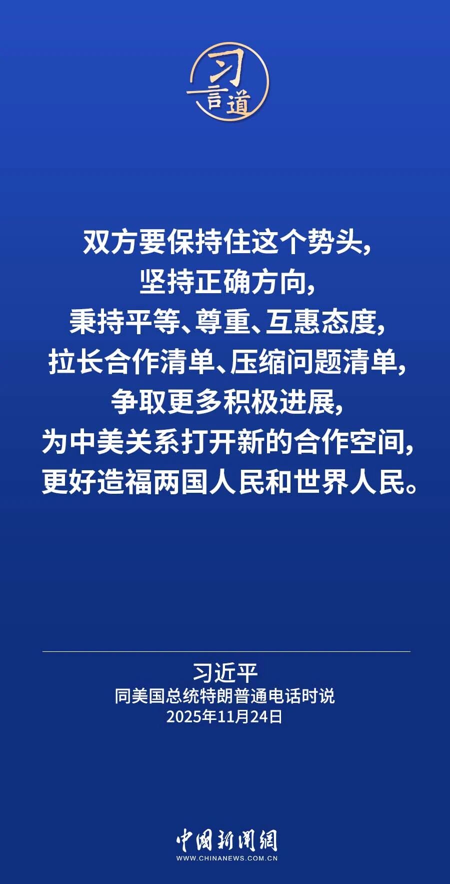 11月24日晚,国家主席习近平同美国总统特朗普通电话。习近平指出——