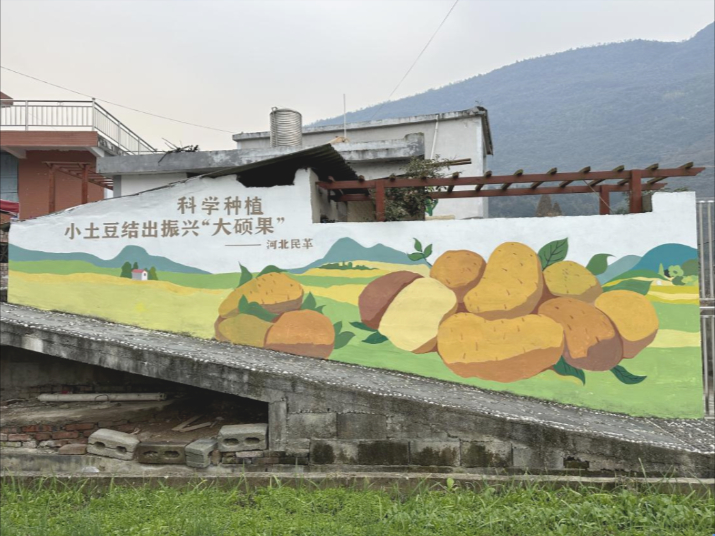 在民革河北中山书画院执行院长王凯的带领下,工作组精心策划、深入调研,将民革帮扶项目的产业发展愿景与新民村的自然风貌、民俗文化巧妙融合,创作出独具特色的墙绘方案,圆满完成6面墙的绘制任务,每一幅作品都成为乡村文化新亮点。